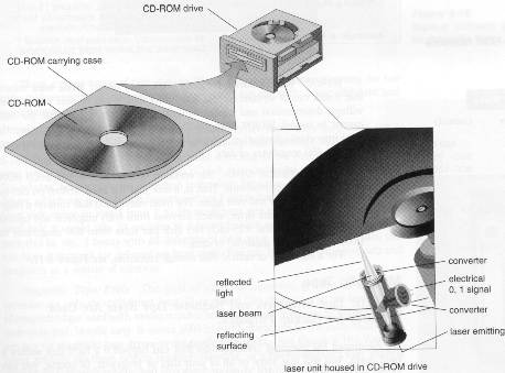 CD-ROMs work very differently. The name is an acronym for Compact Disk - Read Only Memory. You cannot save information or data to a CD-ROM using a normal CD-ROM drive. The information or data on CD-ROM’s is recorded on it by the manufacturer.A CD-ROM stores information and data using light beams. The data is burned into the disk on a spiral track as a series of pits and islands. A coloured laser beam reflecting off this track reads the data and information on the disk.