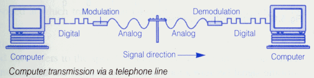 When a computer talks to another computer using a modem, it sends and receives digital information and data to and from the other computer. This information travels between the computers on the telephone line.
