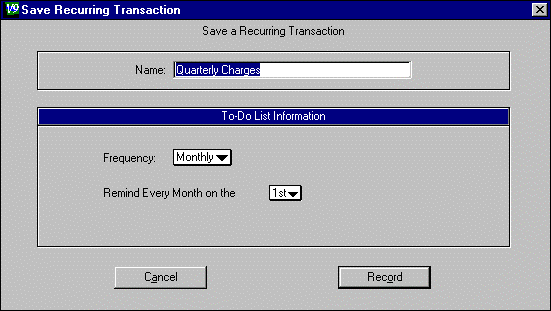 Click on the Recurring Save button to save your entry as a recurring entry. The Save Recurring Transaction window shown below will appear.