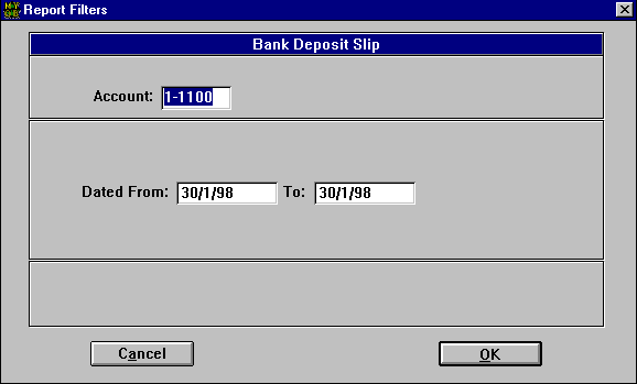 Enter the dates for the beginning and the end of the period you want to print bank deposit slips for in the Dated From: To: fields.Click OK.