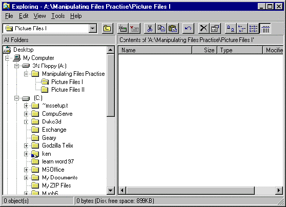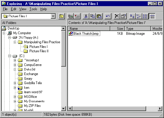We want to copy all the picture files (type Bitmap, extension .bmp) into the Picture Files I folder from the Windows folder on the hard disk. To do this we display the file(s) to be copied in the Files pane of Windows explorer, and the folder they are to be copied to in the Folders pane.