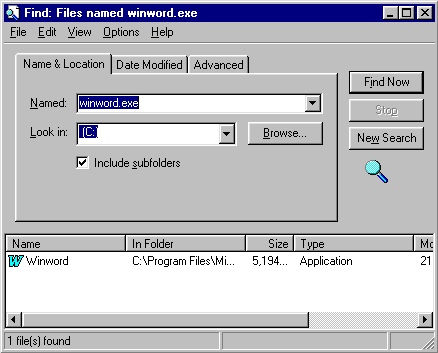 The file Winword.exe will be displayed at the bottom of the Find window.