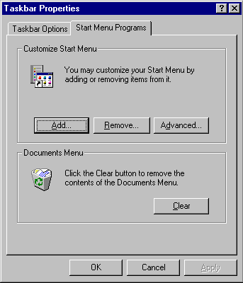 To remove an item from a menu, we remove the shortcut to that program from the menu folder. The easiest way to do this is to use the Taskbar Properties dialog box.