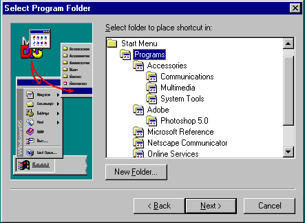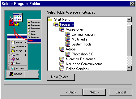 You click on the folder that has the same name as the menu you want the program to appear in. We are putting the Paint program into the Programs menu.