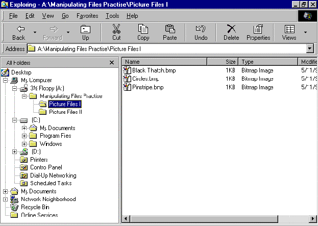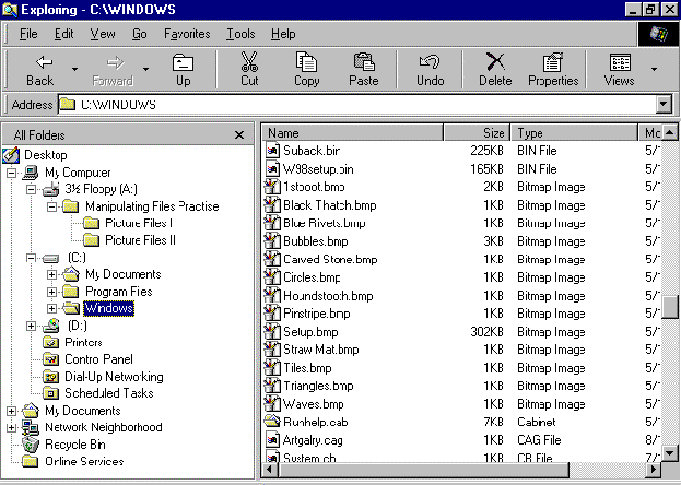 We want to copy all the picture files (type Bitmap, extension .bmp) into the Picture Files I folder from the Windows folder on the hard disk. To do this we display the file(s) to be copied in the Files pane of Windows explorer, and the folder they are to be copied to in the Folders pane.
