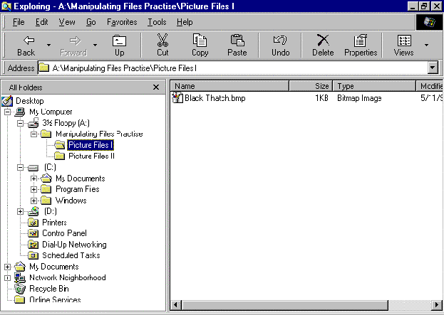 - In the Folders pane, click on the folder name Picture Files I to open that folder in the Files pane. This should display the previously copied file, Black Thatch.bmp
