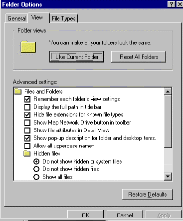- Select View/Folder Options/View (click on the View tab). The dialog box will appear.