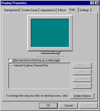 - Click on the Folder Options button to display the Folder Options dialogue box. This will save and close the Display Properties dialogue box. You can then make any changes you wish in the Folder Options dialogue box as discussed in Windows 98 Module 1.