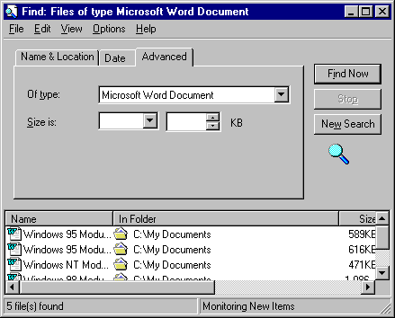 - Now combine this search with files Of Type Microsoft Word Document and Containing text Microsoft. Click on Find Now to see what files, if any, fit this criteria (Microsoft Word files that are greater than 20Kb in size and contain the text Microsoft).
