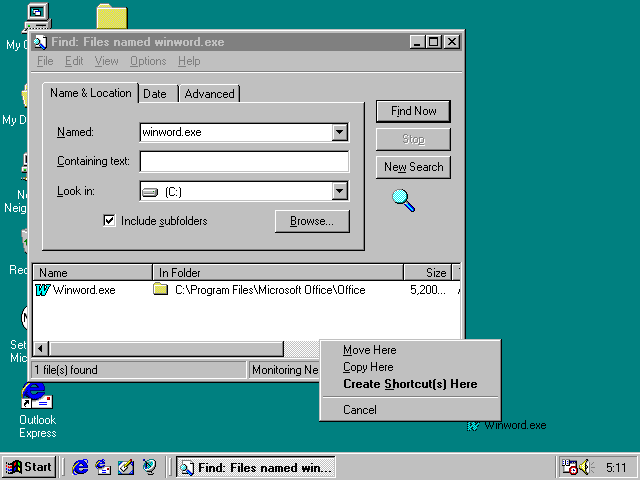 The file Winword.exe will be displayed at the bottom of the Find window.
