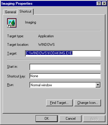 The next step is to set up the Imaging shortcut so it runs in a window on the desktop when Windows 98 first starts up.