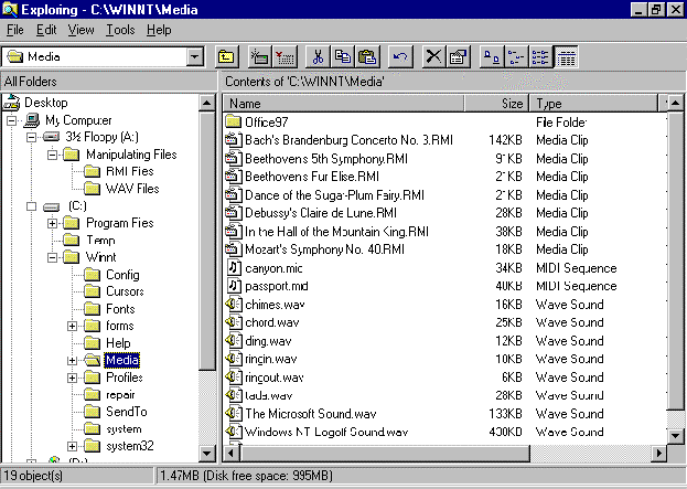 We want to copy all the Media Clip files (extension .RMI) and some of the sound files (extension .wav) from the Media folder in the Winnt folder on the hard disk into the WAV Files folder on the floppy disk.