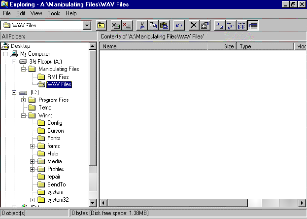 - In the Folders pane, click on the folder name WAV Files to open that folder in the Files pane. The Files pane should be blank, as below.