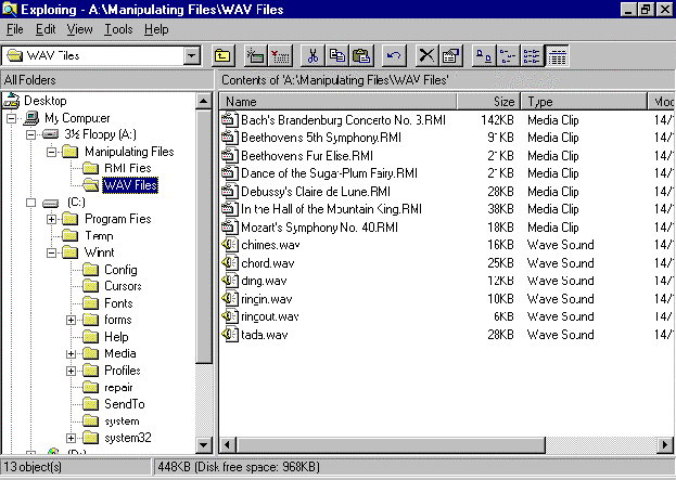 - Click on the folder name WAV Files in the Folders pane to display the contents of the folder in the Files pane. Note that the file Mozart's Symphony No 40.RMI is no longer present.