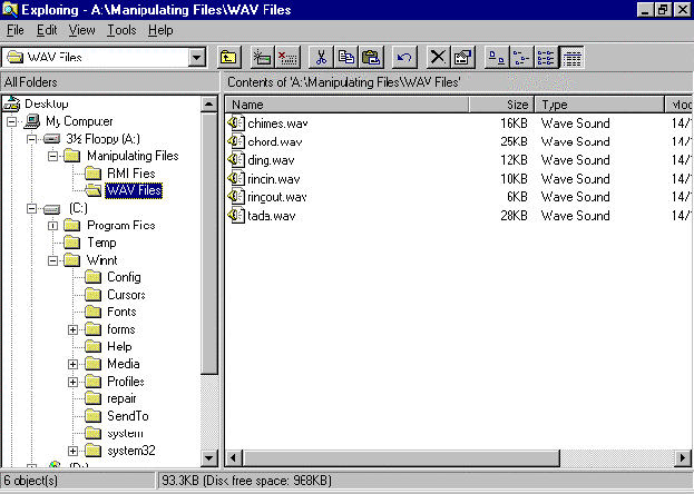 - Click on the folder name WAV Files in the Folders pane to display the contents of the folder in the Files pane. Note that the files Chimes.wav and Ding.wav are now present.