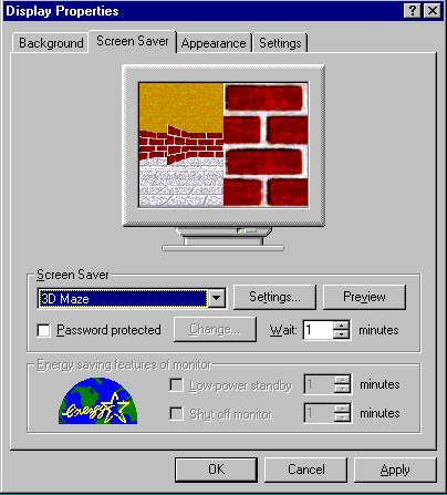 - Click on the black down arrow next to the Screen Saver field. A list of screen savers that come with Windows 95 will appear.