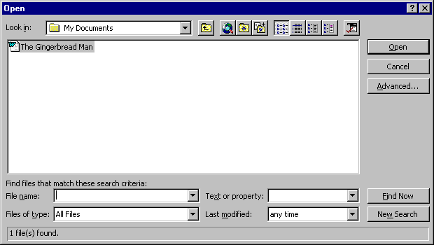 If your document is saved in another folder, you have to change the Look in field to this folder. We will change it to the folder Word97 Training on the C drive.